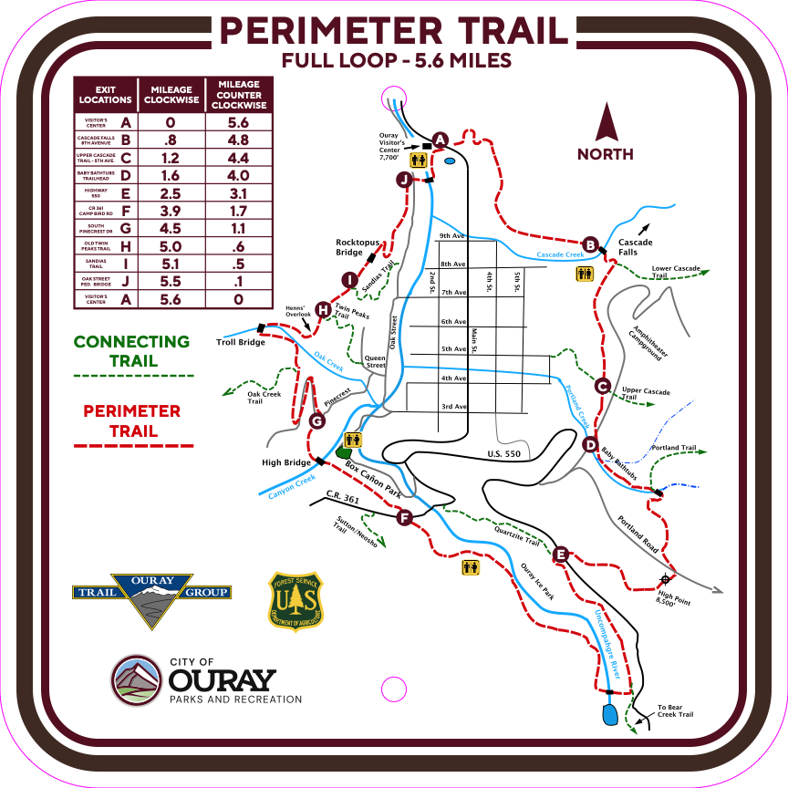 At South Pinecrest Drive♦, continue uphill along a switchback up to the trailhead to the Oak Creek Trail. Shortly after the trailhead, continue up the uphill to a scenic high point where there is beautiful overlook of the City of Ouray and the Amphitheater. The Oak Creek Trail departs to the left from here while the Perimeter Trail descends into rugged Oak Creek Canyon. At the Oak Creek bridge, check underneath the bridge for the troll (or ice climber) and then ascend the stairs and follow the trail out of the canyon to another great viewpoint called Henns’ Overlook. From here, follow the trail downhill to the intersection with the Old Twin Peaks Trail♦, which heads down to the right. Continue straight along the cliff face to the intersection with the Sandias Trail♦, which heads down to the right. Continue straight to continue the trail and take a break on the bench built into the bridge. Please look for the rocktopus on the rocks on the east side of the bridge when overlooking the town of Ouray. Follow the trail down several switchbacks to the end of the trail on Oak Street. To get back to your vehicle, cross the bridge by the City of Ouray Maintenance Buildings, walk through the pool parking lot, and cross Highway 550 to arrive at the parking lot.