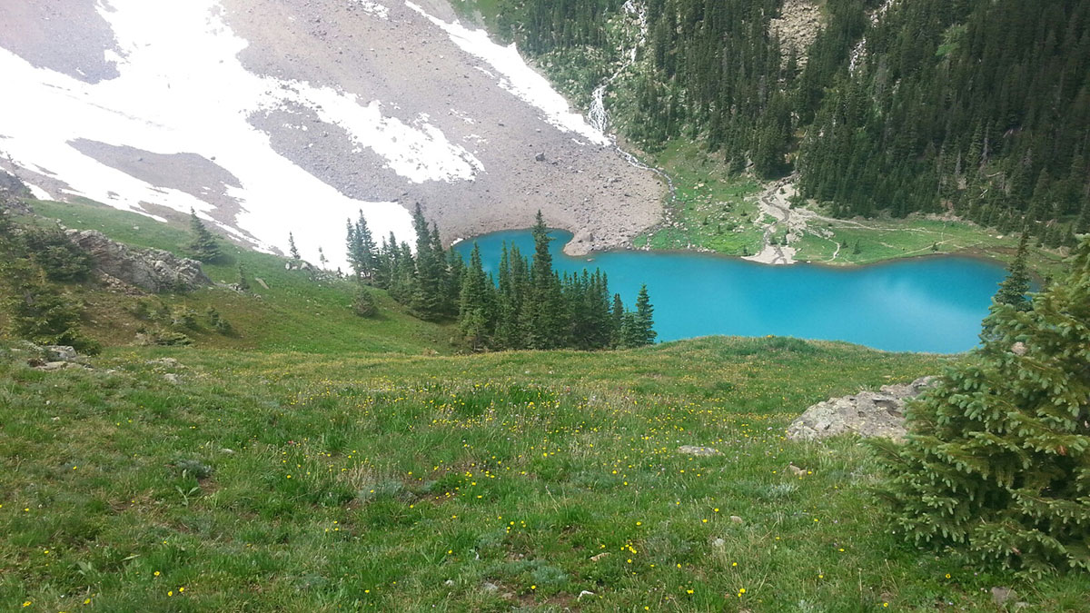 The lower Lake is a rewarding destination for a day hike of 6.6 miles, round trip with an altitude gain of 1,600 feet. The trail leads into the Mount Sneffels Wilderness, which is not accessible to motorized vehicles or to bicycles. You will get early views of the cascades in Dallas Creek and glimpses of Mt. Sneffels; later, Wolcott Mountain becomes prominent ahead.