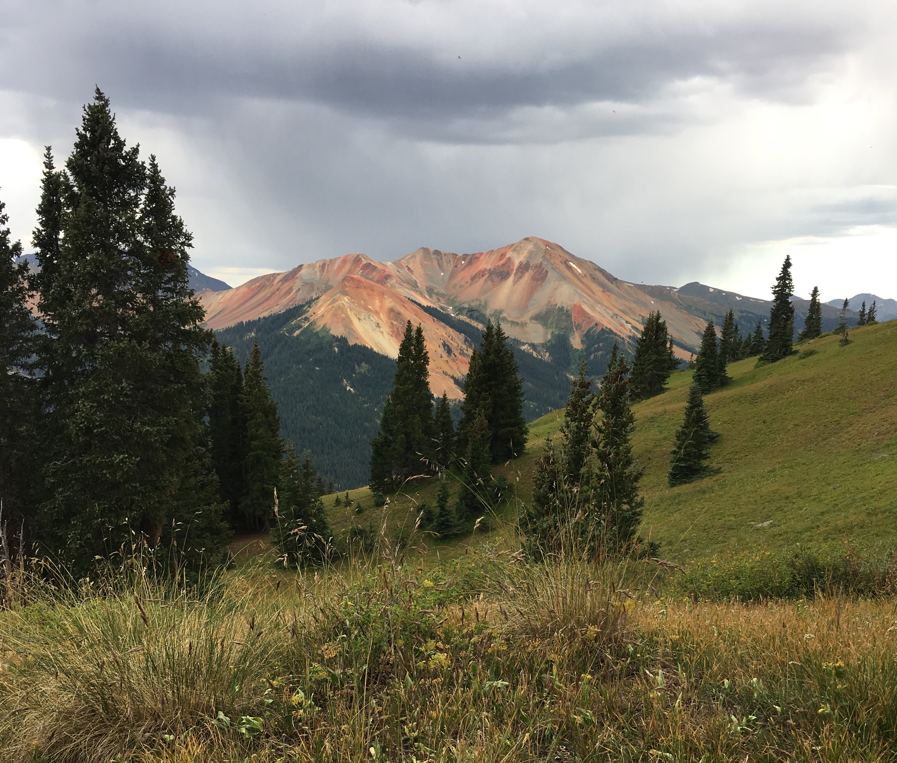 The trail climbs 2.5 miles and 2,200' to meet the Richmond Trail at 11,800', making a good loop with a downhill 1.5 miles on Richmond to US 550. Don't miss a lunch break at a wonderful overlook of the valley at the first open meadow. It's a .6 mile walk north on US 550 back to the parking area at the Larson Brothers mine. The Full Moon Trail can also be done as a scenic out and back, with great views of the Red Mountain area.