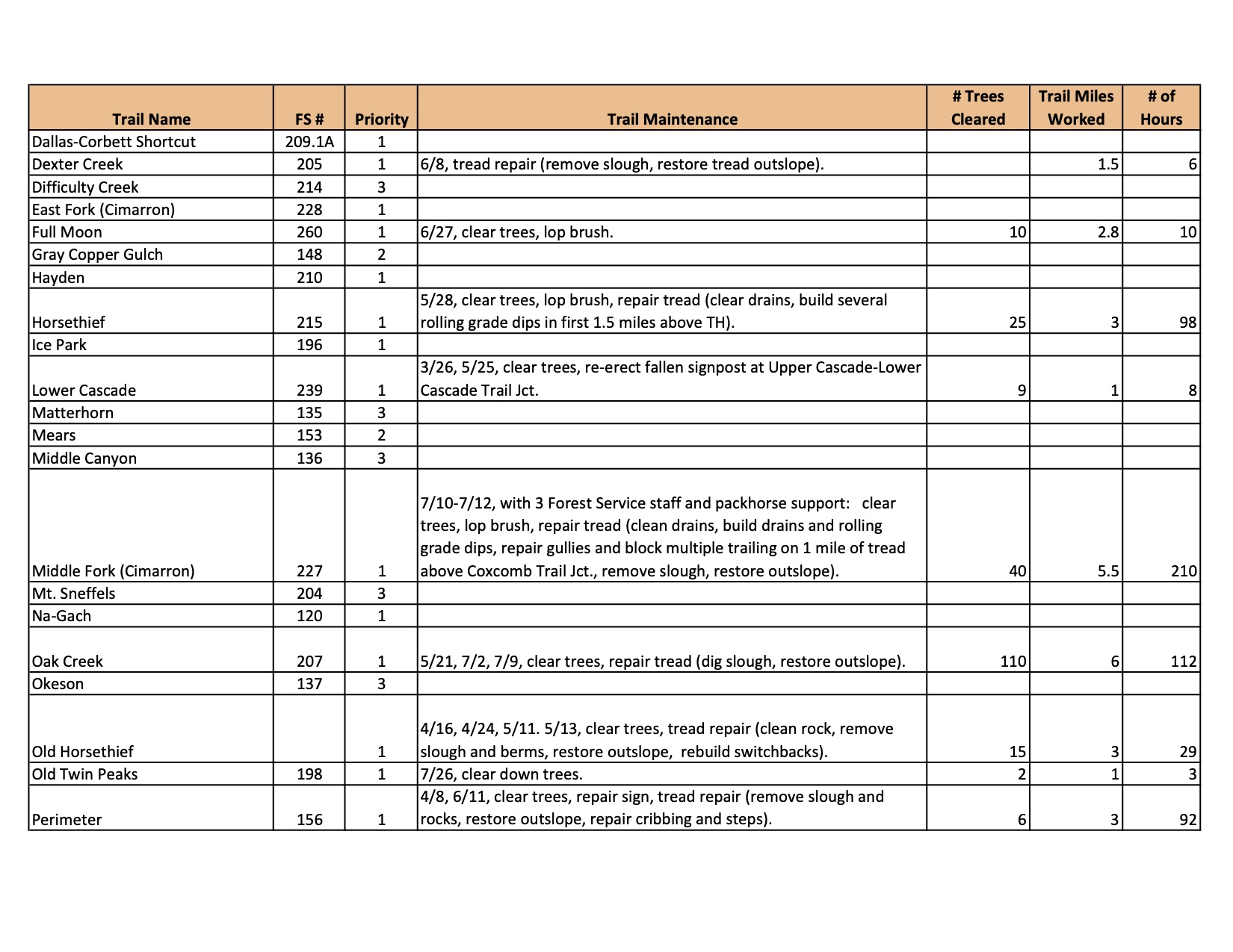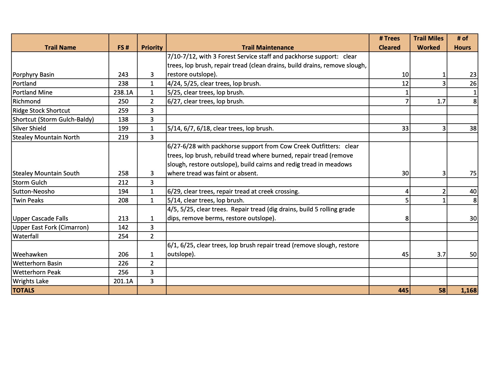 Ouray Trail Group, Trail Maintenance Log March-July 2020