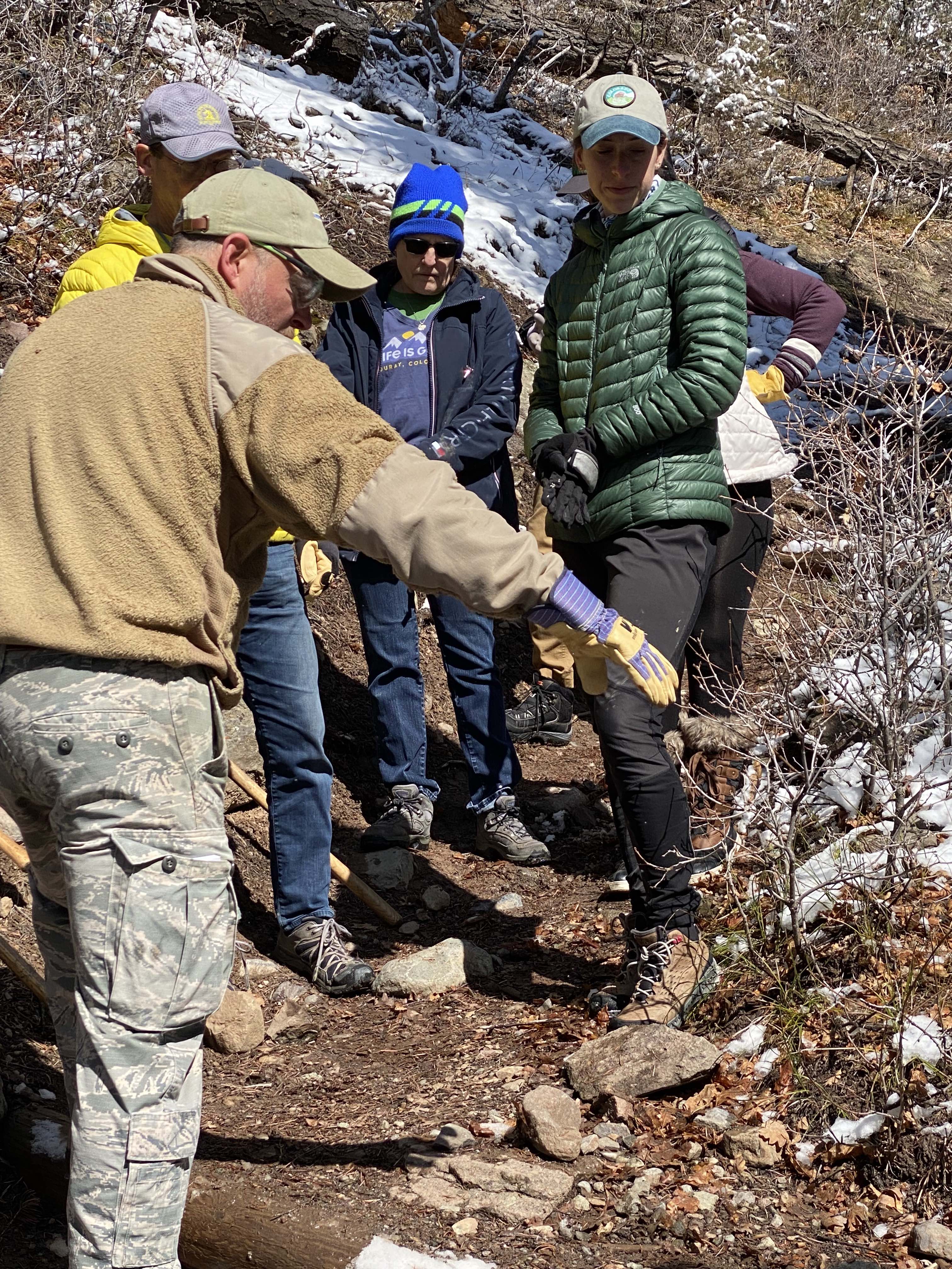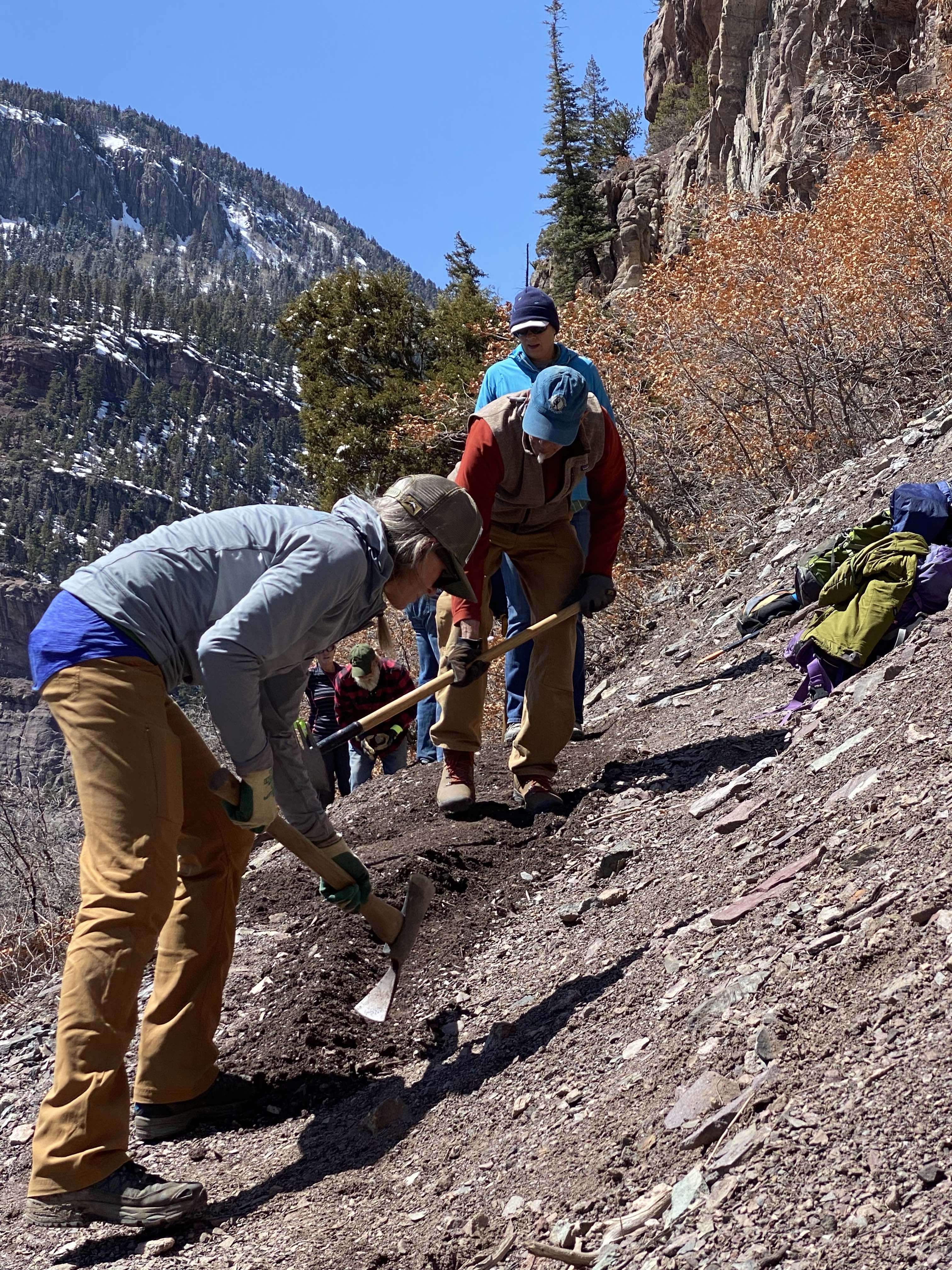 OTG recently offered a class in Trail Maintenance Skills for OTG members. Fourteen OTG members attended the eight hour class held in Ouray on Saturday, April 15. Instructors Steve Boyle, John Hulburd and Justin Dennison spent the day both in the classroom and in the field, sharing skills that will allow participants to recognize and mitigate trail maintenance issues related to water drainage and wear and tear on hiking trails.