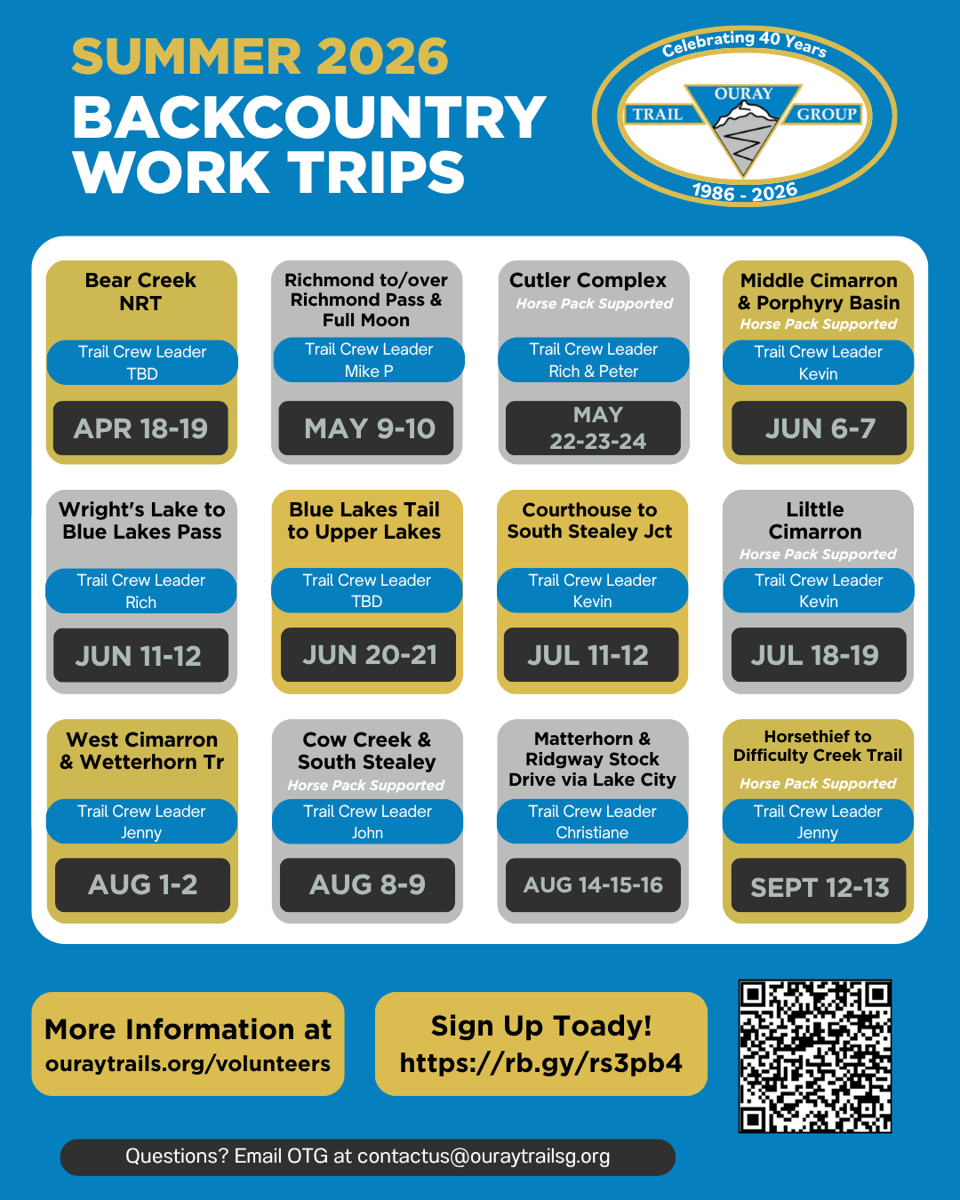 Contact Ouray Trail Group at contactus@ouraytrails.org for additional information about each trip. Your registration below will help us with planning for tools and transportation.